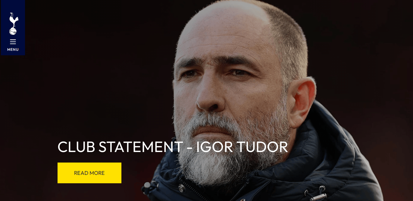 热刺官方公告称:“我们在此确认,主教练伊戈尔-图多尔已与俱乐部达成一致,即刻离任。”